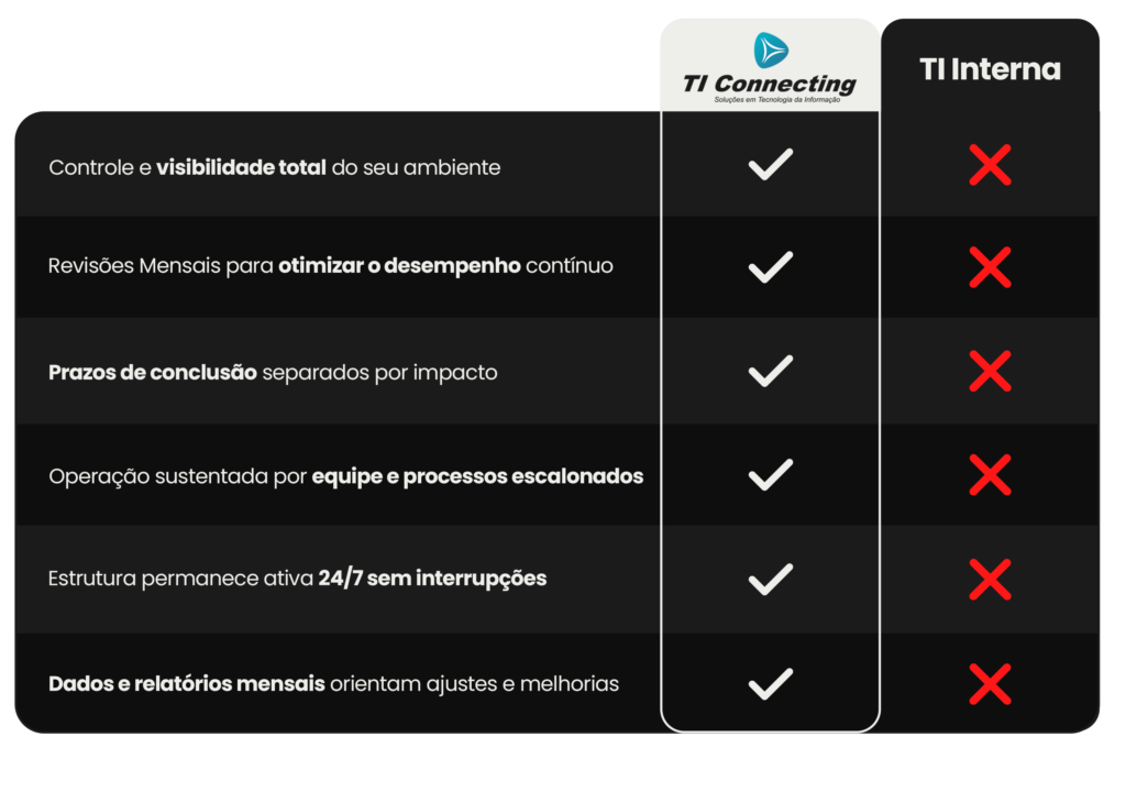 O técnico interno atua como um único ponto operacional. Já o nosso modelo funciona como um sistema de suporte, com especialistas por área, processos documentados, monitoramento contínuo e métricas de desempenho. Isso reduz dependência de uma única pessoa e aumenta a resiliência técnica e operacional.